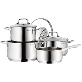 WMF offre la serie di stoviglie adatta a ogni esigenza. Le singole serie si differenziano per il design, la dotazione del prodotto e gli accessori offerti. Tutto questo insieme è la qualità garantita WMF. Materiale: Cromargan® Le pentole sono in Cromargan®, il marchio registrato WMF per l'acciaio INOX 18/10. Questo materiale è neutro nei confronti dei sapori, resistente contro gli acidi alimentari e lavabile in lavastoviglie: raggiunge così le migliori qualità di uso e di manutenzione. Tutte le pentole sono robuste e resistenti a graffi e colpi; rimangono indistruttibili anche con l'uso intenso. Fondo: fondo transtermico adatto a tutti i piani cottura  Fondo transtermico adatto a tutti i piani cottura La caratteristica qualitativa più importante nelle pentole è il fondo. Per questo si ha bisogno innanzi tutto di un materiale che assorba bene il calore e lo distribuisca in modo uniforme. L'alluminio ha queste qualità: assorbe il calore molto rapidamente e lo distribuisce in maniera omogenea sulla pentola e ciò che vi viene cotto. Il fondo transtermico, adatto a tutti i tipi di fornelli, è fatto di un nucleo di alluminio racchiuso in una capsula di acciaio cromato. In questo modo l'alluminio non potrà più essere danneggiato da detersivi aggressivi. Il fondo transtermico è adatto a tutti i tipi di piani cottura, compresi quelli a induzione, poiché l'acciaio cromato usato per la capsula è magnetico. Per cucinare risparmiando quanta più energia possibile, il fornello dovrebbe essere scelto sempre della stesso diametro del fondo pentola. La resistenza di un fondo pentola decide della quantità di calore che può essere assorbita e salvata. Il fondo transtermico di WMF trattiene così tanto calore che il fornello può essere spento in anticipo. In questo modo si cucina risparmiando energia. Tramite il calore residuo trattenuto dal fondo, le pietanze nella pentola rimangono calde per molto tempo. I fondi delle pentole e padelle WMF sono bombati. Attraverso questo procedimento, il fondo acquista una leggera convessità. Quando la pentola viene scaldata, il fondo si dilata posizionandosi perfettamente sul fornello. Così vengono garantiti un appoggio stabile e una distribuzione ottimale del calore. Quest'ultima è particolarmente importante per i piani cottura elettrici. Bordo Tutte le stoviglie WMF hanno un buon bordo. Posto verso l'esterno permette di versare le pietanze in modo sicuro e ben dosato, senza gocciolamenti. Manici Anche i manici in Cromargan® delle pentole WMF sono resistenti, lavabili in lavastoviglie e adatti al forno. Sono saldati a punti e dunque collegati indissolubilmente alla pentola. Non sono utilizzate viti, che si potrebbero allentare. Grazie all'eccellente costruzione, nemmeno l'acqua può penetrare fra la pentola e il manico. I manici in Cromargan® danno un aspetto eccellente alla pentola. Le pentole della serie Collier hanno manici profilati. Sono metallici e massicci e si scaldano quando i tempi di cottura sono lunghi. In alcuni casi, il riscaldamento dei manici è influenzato dal riempimento della pentola, dal tipo di alimento, dal tempo di cottura e dalla sensibilità soggettiva al calore. Coperchio Un buon coperchio deve chiudere bene la pentola. Le stoviglie WMF soddisfano questa esigenza. Le pentole della serie Collier hanno coperchi in vetro che rimangono stabili e sono dunque ideali per la cottura a fuoco lento con poca acqua. In questo modo il vapore che sale si condensa e ritorna nella pentola sotto forma di acqua. Il coperchio in vetro permette inoltre la cosiddetta "cottura a vista". È adatto al forno fino a 180°C. Forme e dimensioni delle pentole A seconda del piatto cucinato, sono necessarie pentole diverse. Fondamentalmente, la forma e la dimensione della pentola dovrebbe essere adatta al tipo di pietanza. Le pentole più grandi sono più flessibili, perché è possibile cucinarvi anche piccole quantità. Si sono affermate le seguenti forme: Pentola per arrosto: Pentola piatta, ideale per stufare. Dopo la rosolatura, la carne viene inumidita con del liquido e cuoce quindi lentamente nella pentola chiusa, a temperatura bassa, sul fornello o in forno. Pentola da carne: Pentola medio-alta per grandi quantità. Particolarmente adatta per sbollentare verdure voluminose come cavolfiori o broccoli. Anche per minestroni di carne o di verdure. Casseruola con manico: La piccola pentola dal manico lungo è particolarmente maneggevole e versatile. Ideale per mescolare sul fornello. Il manico è pratico per riempire e versare. Per quanto riguarda le dimensioni delle pentole, pochi diametri si sono affermati: 16, 20 e 24 cm, più raramente anche 18 cm. Si misura la parte alta, sul bordo della pentola.